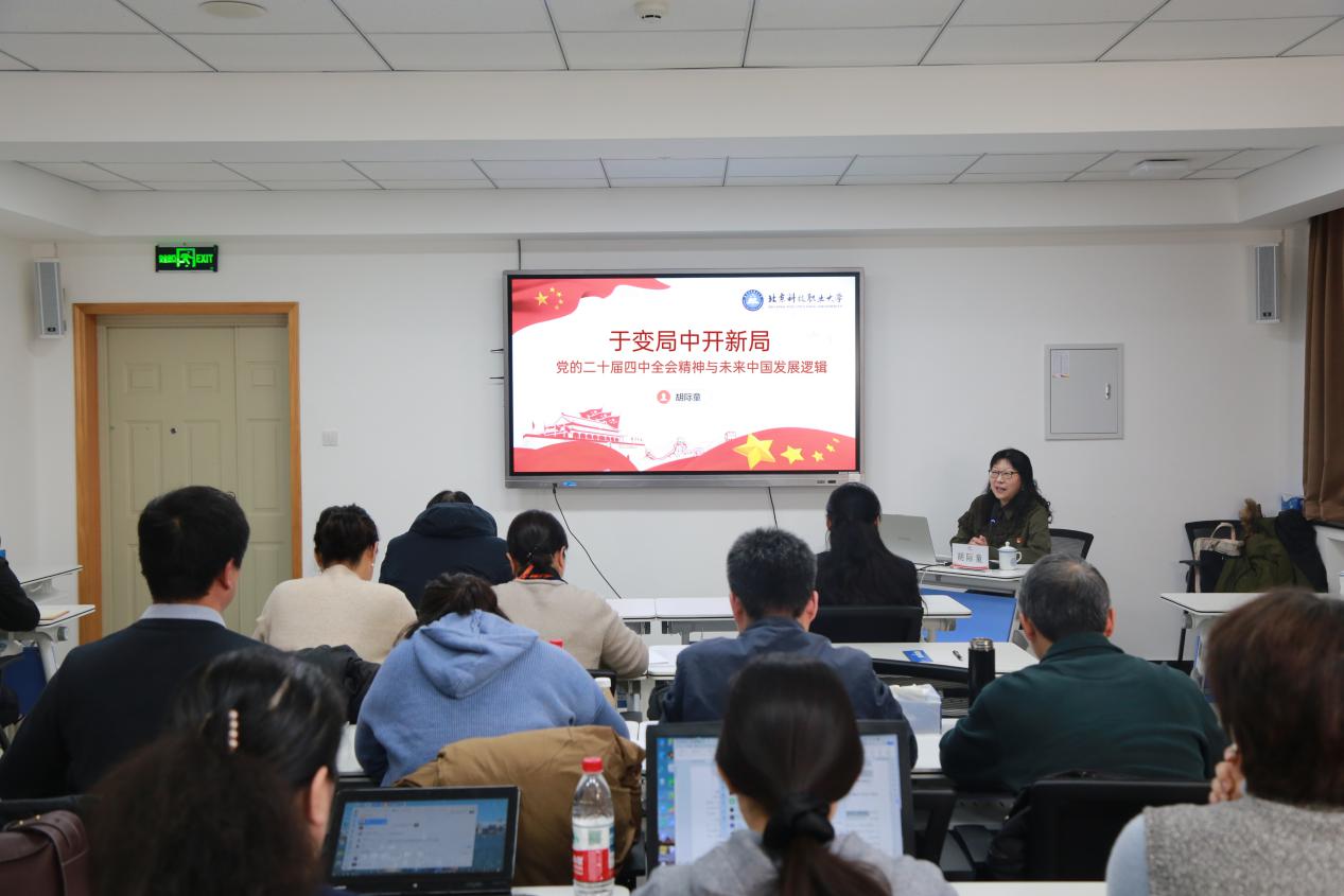 北京科技职业大学马克思主义学院副教授胡际童作《于变局中开新局——党的二十届四中全会精神与未来中国发展逻辑》的专题培训,课程以“领悟变局、阐释新局、走好开局”为脉络,立足百年变局加速演进的时代背景,系统剖析国际国内发展的机遇挑战,将新一轮科技革命、新质生产力培育、民生保障等时事热点与政策理论深度融合,为学员明晰发展方向、把握国家战略提供了兼具高度与温度的思想指引。