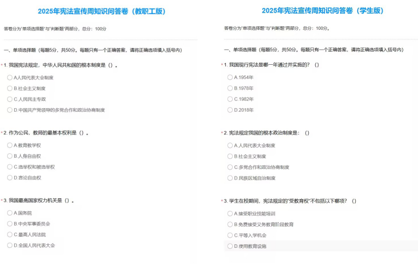 创新设计知识问答,运用新型学习载体,设计开发《职工互动齐闯关》小程序,增强学习互动性和趣味性;有机融合宪法知识和个人权益主张,科学设计宪法知识问答问卷,全校3600多名师生广泛参与线上知识问答活动,实现宣传学习全员覆盖。