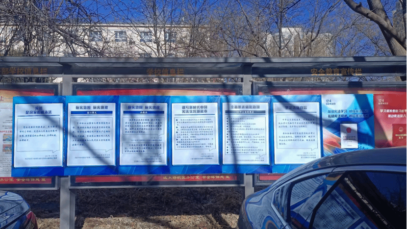 学校在校区教学楼、办公楼等公共空间张贴宪法宣传海报,充分利用官网、微信公众号、电子屏等播放宪法公益宣传片和海报。校园广播站每日播报宪法小知识、法治小故事。各班级制作宪法主题板报,以画笔和文字展现对宪法的理解。构建了全方位的宪法宣传阵地,实现校园全媒体覆盖,让师生在抬头可见、驻足可观的浓厚宪法氛围中,“抬头见法、处处学法”,潜移默化增强法治意识。