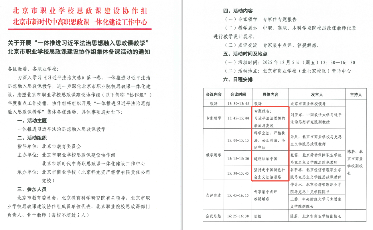 推动习近平法治思想融入思政课教学,学校承办“一体推进习近平法治思想融入思政课教学”北京市职业学校思政课建设协作组集体备课活动,邀请中国政法大学习近平法治思想研究院副教授刘亚东作“习近平法治思想的形成与发展”专家报告,来自北京市60家职业学校思政课骨干教师代表参加了集体备课活动。
