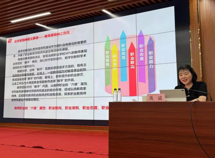 禹诚教授结合自身丰富的教育实践,紧扣“教育家精神”的深刻内涵,对新时代职业教育的使命担当、师德师风建设的核心要义以及如何践行教育家精神等方面进行了深入阐释。激励在座教师坚守教育初心,勇担育人使命,以“大先生”的标准要求自己,为培养担当民族复兴大任的时代新人贡献力量。