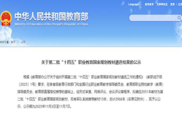 近日,教育部公布第二批“十四五”职业教育国家规划教材遴选结果,我校主编的8本教材成功入选公示,标志着我校教材建设工作再上新台阶。这是继首批6本教材入选后,我校在国家级教材建设领域取得的又一重大突破。