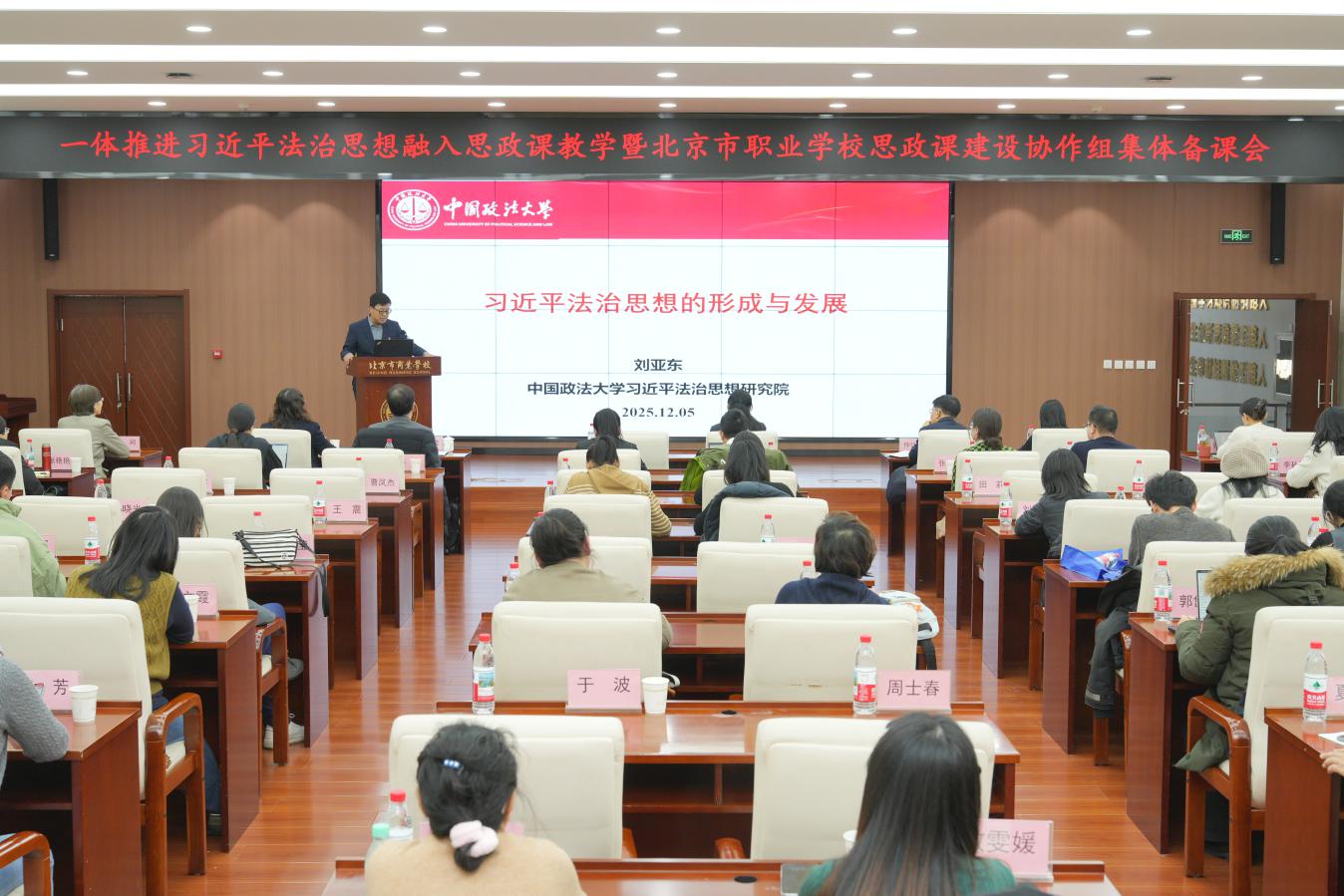推动习近平法治思想融入思政课教学,学校承办“一体推进习近平法治思想融入思政课教学”北京市职业学校思政课建设协作组集体备课活动,邀请中国政法大学习近平法治思想研究院副教授刘亚东作“习近平法治思想的形成与发展”专家报告,来自北京市60家职业学校思政课骨干教师代表参加了集体备课活动。