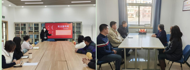 部门支部联动研学,以科务会或主题党日活动的形式,组织教职员工学习宪法相关知识,观看专题宣传片,学唱《宪法伴我成长》法治歌曲,结合部门业务职能,开展“把宪法精神融入履职全过程”专题研讨,有效增强教职员工尊崇宪法、学习宪法、遵守宪法、维护宪法、运用宪法的思想自觉和行动自觉。