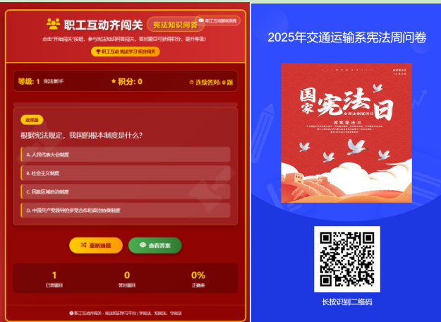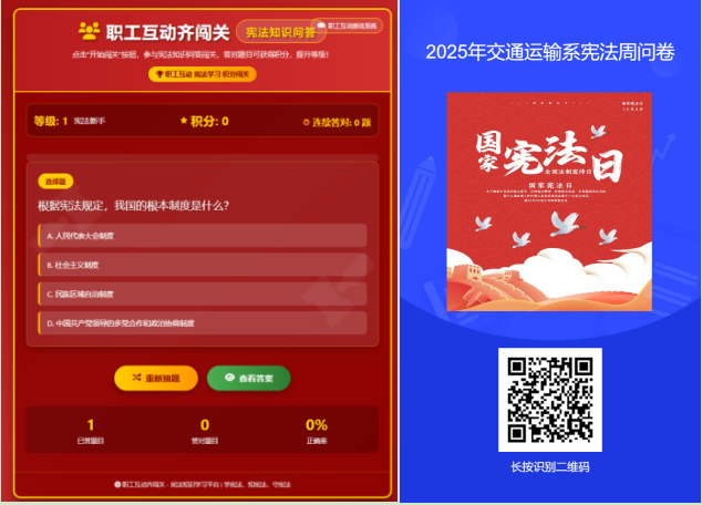 创新设计知识问答,运用新型学习载体,设计开发《职工互动齐闯关》小程序,增强学习互动性和趣味性;有机融合宪法知识和个人权益主张,科学设计宪法知识问答问卷,全校3600多名师生广泛参与线上知识问答活动,实现宣传学习全员覆盖。