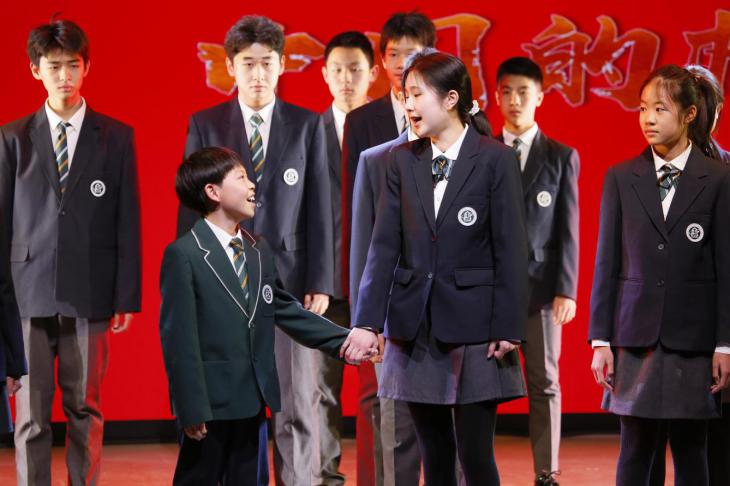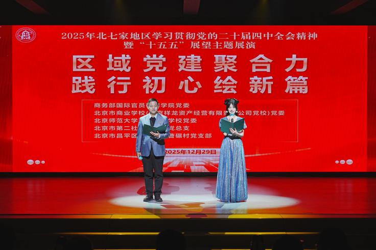 为深入学习贯彻党的二十届四中全会精神,展望"十五五"发展蓝图,凝聚区域奋进力量,12月29日,由北京市商业学校、商务部国际官员研修学院、北京师范大学亚太实验学校、北京市第二社会福利院、北京市昌平区北七家镇曹碾村党支部联合主办的“区域党建聚合力 践行初心绘新篇”主题展演活动在北京师范大学亚太实验学校隆重举行。商务部国际官员研修学院党委书记、院长吴彬,北京市商业学校党委书记邢连欣、党委副书记李光勤,北京师范大学亚太实验学校党委书记、校长徐向东,北京市第二福利院党总支书记、院长王春梅,北七家镇曹碾村党支部书记王茂胜等领导及师生代表、社区工作人员共聚一堂,以艺术化形式让党的创新理论深入人心,共同凝聚高质量发展共识。 北京市商业学校党委书记邢连欣在致辞中回顾了区域化党建的坚实足迹。五家单位秉持“区域联动、资源共享、优势互补、共促发展”理念,从共赴八宝山革命公墓开展“缅怀先烈铸忠诚”主题党日活动,到在建党百年之际,举行中国共产党成立100周年文艺汇演,一次次务实合作让彼此从“相邻”走向“相亲”,从“共建”迈向“共赢”,未来也将进一步加强合作共建,强化区域党建引领高质量发展。 活动以“思政+艺术”的创新形式,让党的创新理论“活”起来。展演在思政情景剧《觉醒年代》中拉开序幕,北京市商业学校学生用青春演绎革命先驱的信仰之光;思政情景剧《赫赫而无名的人生》带领观众感悟隐姓埋名的家国情怀;诗朗诵《一座水库的精神丰碑——致敬十三陵水库建库精神》铿锵有力,展现新时代青年对奋斗精神的传承;青年学习社带来的思政情景剧《这十年·青春志》生动诠释了当代青年的责任与担当。北京师范大学亚太实验学校阳光剧社、金帆合唱团、阳光舞蹈团联袂演出多学科融合思政情景剧《当我走过你的路》,将现场气氛推向高潮。 思政情景剧《觉醒年代》 思政情景剧《赫赫而无名的人生》 诗朗诵《一座水库的精神丰碑——致敬十三陵水库建库精神》 思政情景剧《这十年·青春志》 多学科融合思政情景剧《当我走过你的路》 本次活动既是学习贯彻党的二十届四中全会精神的生动课堂,也是区域化党建成果的集中展示。未来,五家单位将持续以党建为纽带,以合作共赢为目标,在新时代新征程上书写更加绚丽的篇章。