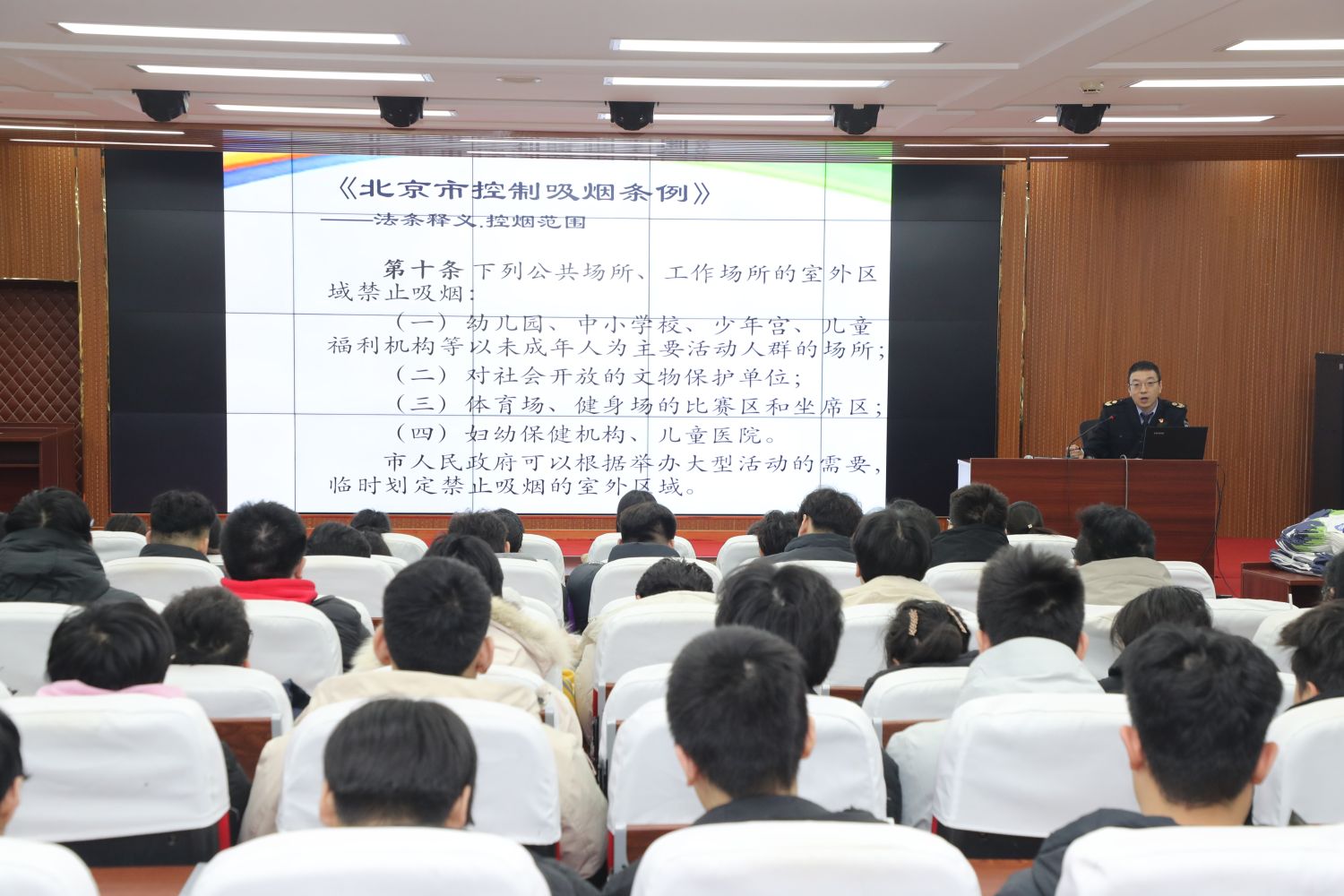 专家对《北京市控制吸烟条例》核心条款进行了系统、权威的官方解读,重点梳理了校园控烟、公共场所禁烟的相关规定,清晰明确了个人违规吸烟需承担的法律责任,以及各类经营主体应当履行的控烟义务。专家通过典型案例、数据对比等形式,生动阐释了控烟法规的制定背景与现实意义,引导学生不仅要自觉遵守控烟各项法规,更要主动监督身边的违规吸烟行为,共同参与到无烟公共环境的维护中来。
