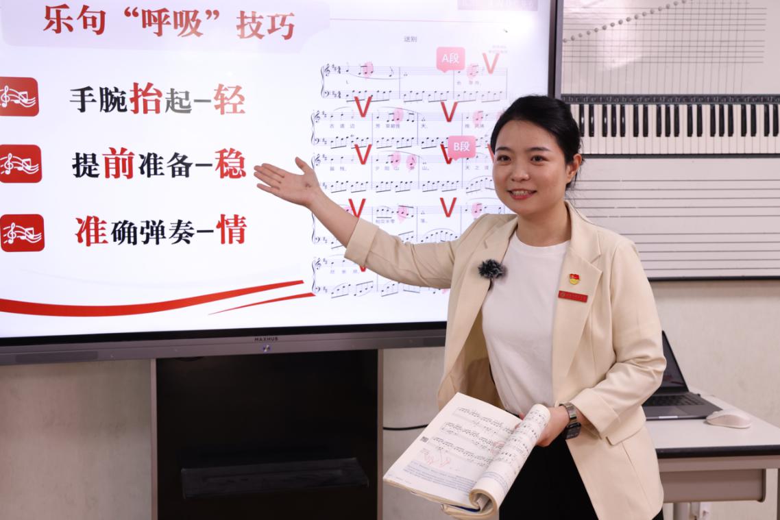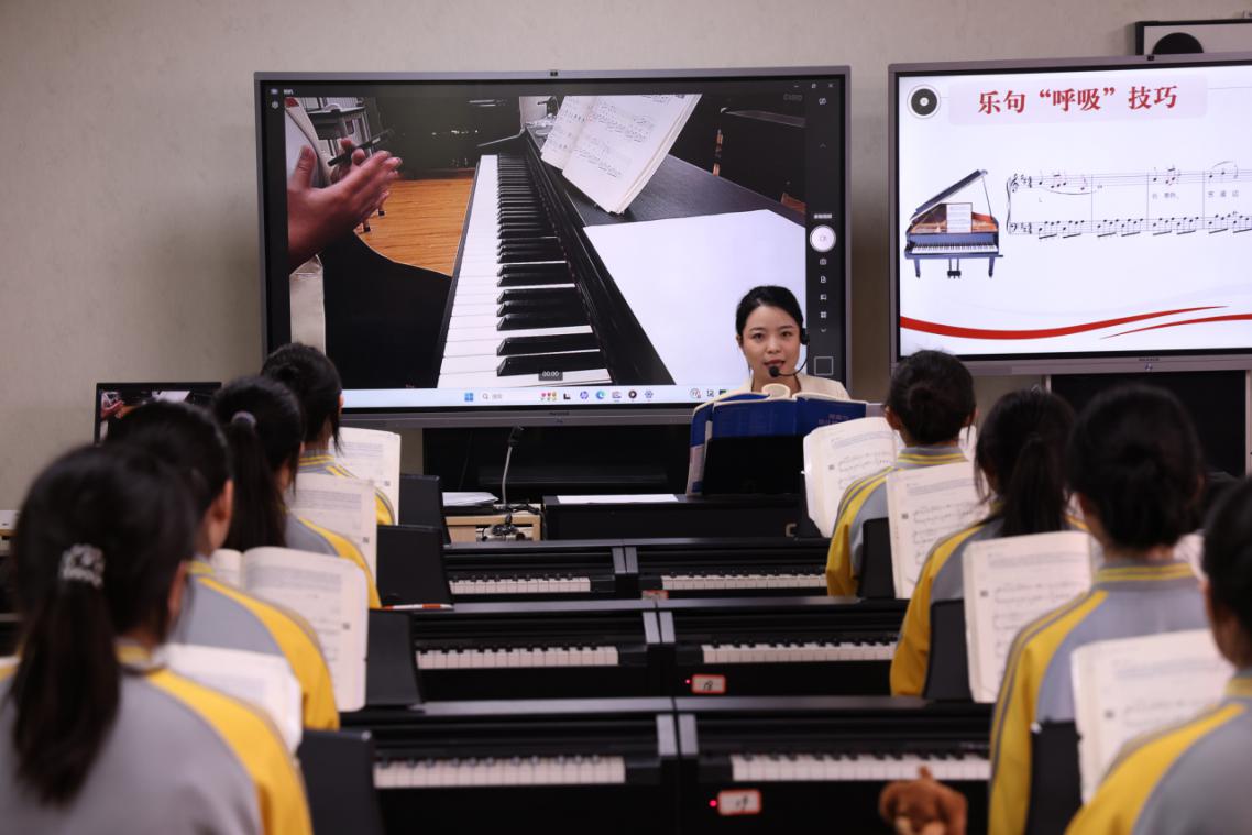 教学紧扣“抬、前、准”三字口诀,系统讲解手腕抬起、提前准备、准确弹奏的呼吸技巧,并通过边弹边唱、小组互评等方式,帮助学生掌握右手旋律的呼吸处理与节奏对位。课程融合AI课前纠错、实时投屏等信息化手段,强化细节规范,突破弹奏难点。