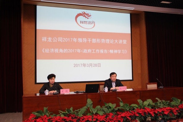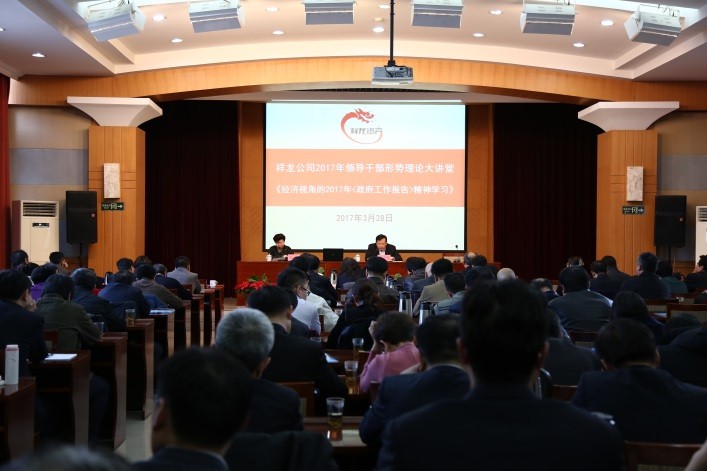 祥龙公司2017年干部培训工作启动大会暨领导干部形势理论大讲堂首场报告会于3月28日在北京祥龙公司党(干)校举办。大会由党委副书记文波主持,祥龙公司党委书记、董事长孟卫东作开班动员,北京市委讲师团成员、中国财政科学研究院研究员张鹏作题为《“困难不容低估,信心不可动摇”——经济视角的2017年< <>政府工作报告>》精神学习》的报告。祥龙公司领导班子成员、中层领导干部、基层党政主要负责人共169人参加了开班动员和报告会。
