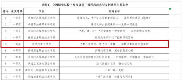 在由教育部职业院校文化素质教育指导委员会主办,全国职业院校课程思政研究院承办的全国职业院校“战疫课堂”课程思政典型案例评选中,我校选送的典型案例《“数”说战疫 数“您”最棒——指数函数的应用举例》荣获了一等奖。