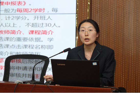 第三环节,为了更有针对性的指导教研室开展“人人说规范教案”的教研室活动,教务处张倩老师从一次活动、两次培训、三次会议三个方面布置了本学期教研室具体工作任务。