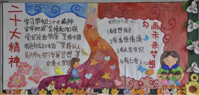 按照学校党委部署,为深入学习贯彻党的二十大精神广泛开展主题突出、特色鲜明、形式多样的学习宣传活动。精心组织“学”,广泛深入“讲”,结合实际“干”,用科学的、时尚的、艺术的、情感的方式方法深刻领悟好、准确把握好、贯彻落实好党的二十大精神。深入推进二十大精神“七进”,切实融入到学生教育的各方面、各领域、各环节全过程培养。充分发挥学生的思想政治教育功能,推动党的二十大精神落地生根。近日,教育艺术系在党建带团建中,组织全体同学开展“青春献礼二十大,强国有我新征程”主题征文活动和“学习二十大精神 勾画未来新梦想”板报比赛。