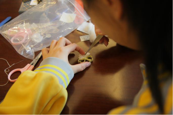 同学们制作了具有商校元素的“梨花胸针”,表达对学校浓浓的情谊。