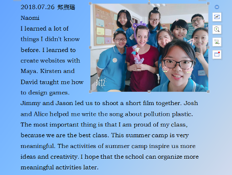 2017级小学教育专业4班的郑煦瑶同学在其英语日志里写道:夏令营非常有意义,各项活动大大激发了我更多的思想和创造力。