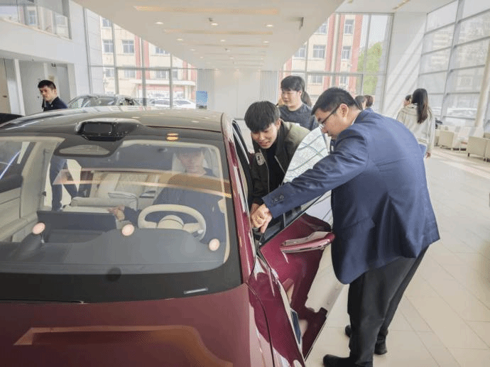 活动伊始,祥龙博瑞八分公司人力资源部部长蒲义热情接待了学生们,并亲自带领他们参观了销售展厅、售后服务区、维修车间等关键部门。在销售展厅,蒲部长详细阐述了所销售汽车的品牌和车型,生动展示了销售现场直播的过程,让学生们亲身体验展示车辆,直观感受传统车辆向电动化、智能化转型的强劲趋势。在售后维修区,蒲部长耐心地向学生们介绍了客户接待流程及维修保养的操作流程,使学生们对汽车售后服务的各个环节有了清晰的认识。